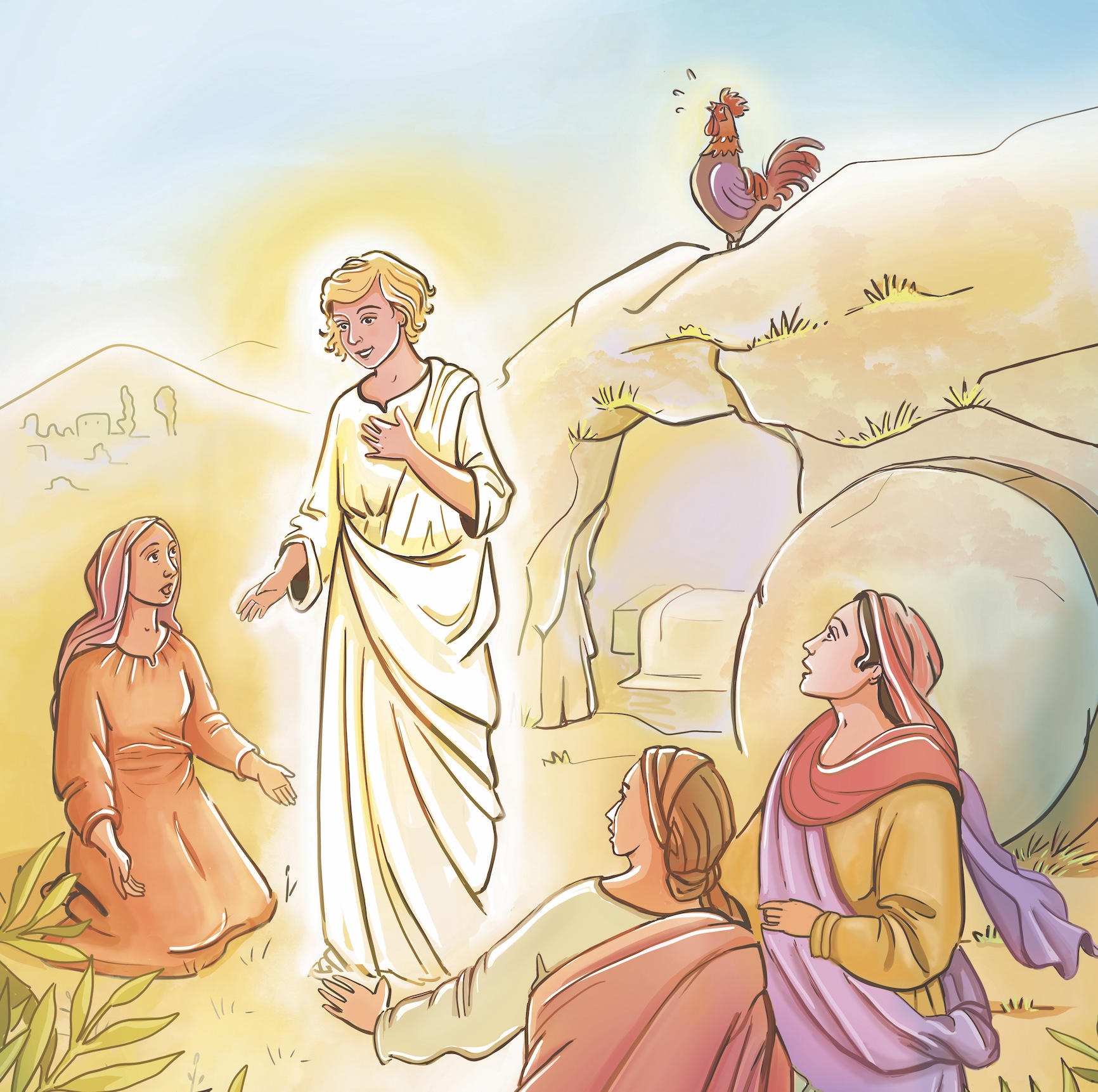 Trois femmes chuchotent craintivement en se hâtant vers l’endroit où Jésus a été déposé, mais la pierre ne ferme plus l’entrée du tombeau ! Et qui est ce jeune homme en vêtements blancs, tout nimbé de lumière ? Il dit aux femmes :