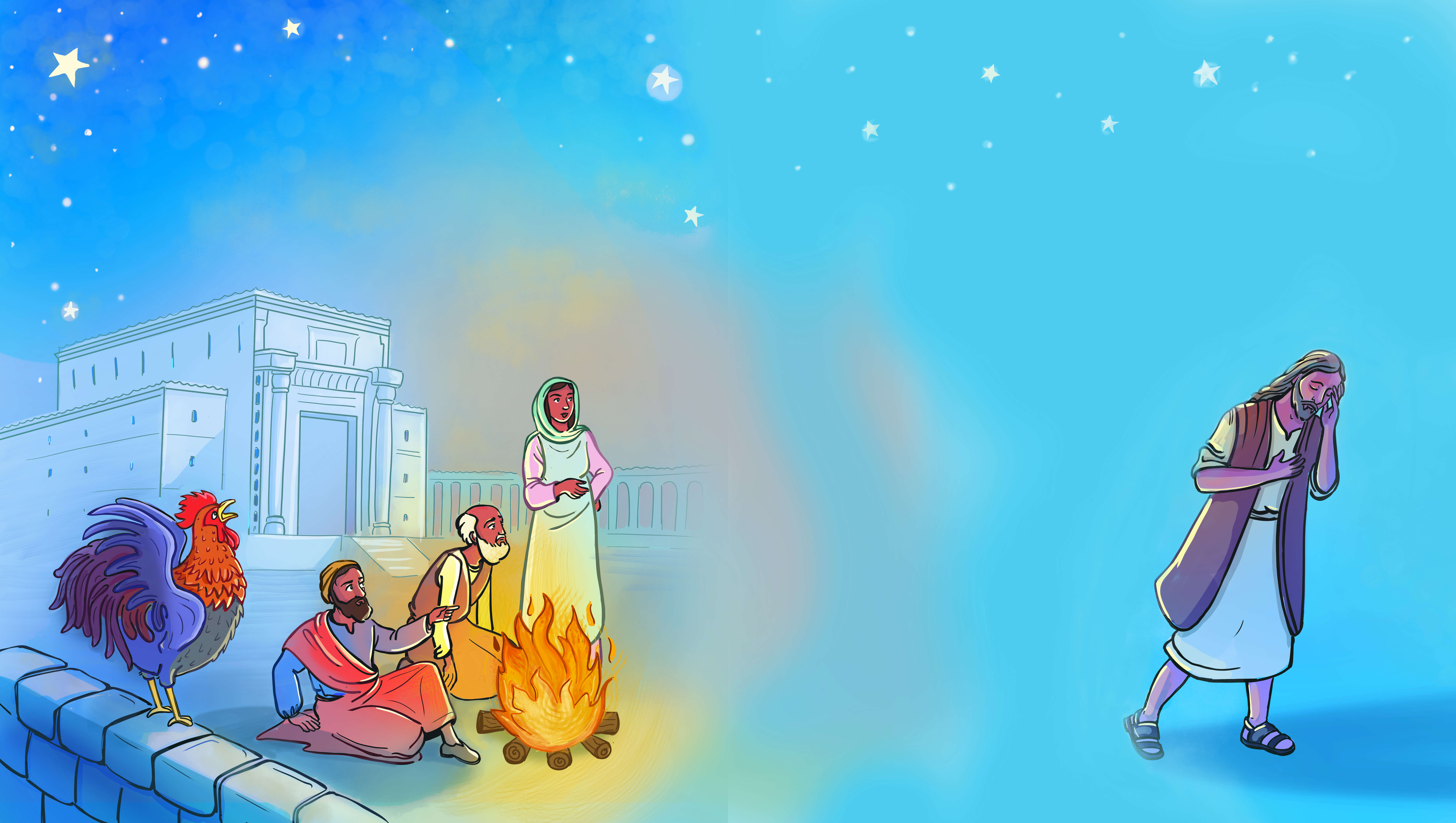 Je me rends au palais du grand-prêtre et m’installe dans un coin pour dormir. Un mouvement furtif me réveille : je reconnais l’homme qui passe près de moi, c’est Pierre. Il cherche à pénétrer dans la cour du palais. Un de ses compagnons le fait entrer et je le vois se diriger vers le feu. Puis j’entends la voix de la jeune servante qui garde la porte :