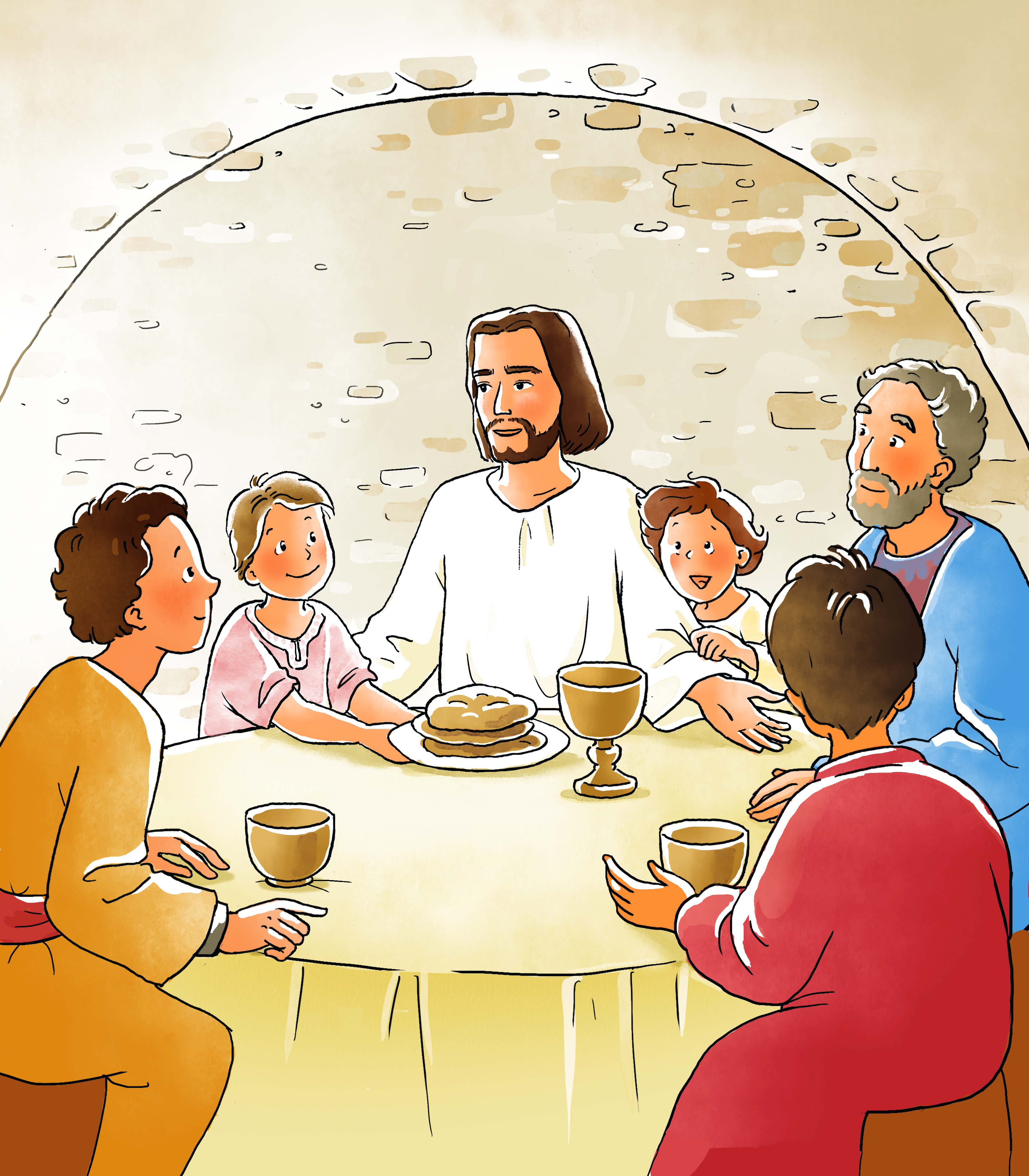 Quelle joie d’être invitée avec mon ami Simon au repas qui nous fait entrer dans la grande fête juive de la Pâque ! Bien sûr, nous n’avons pas de place à table, mais nous pouvons nous glisser près de Jésus pour écouter ce qu’il dit à ses disciples. Nous sommes aussi ravis de rendre service. Je pose devant Jésus un beau plat de pains sans levain bien croustillants. Jésus en prend un, il récite une prière de bénédiction, puis il le rompt en disant : « Ceci est mon corps, qui est pour vous. Faites cela en mémoire de moi. » Il donne alors les morceaux à ses apôtres qui les mangent avec un grand respect. « Que se passe-t-il ? » me souffle Simon. Je chuchote : « Je ne sais pas. Je ne crois pas qu’on fasse ça d’habitude pendant le repas pascal. » À la fin du repas, Jésus prend la coupe de vin et dit : « Cette coupe est la nouvelle Alliance en mon sang. Chaque fois que vous en boirez, faites cela en mémoire de moi. » Puis il la donne à Jean assis près de lui, qui en boit une gorgée avant de la tendre à son voisin. Je me souviens alors d’une parole de Jésus qui avait choqué beaucoup de monde : « Ma chair est la vraie nourriture, et mon sang est la vraie boisson. Celui qui mange ma chair et boit mon sang demeure en moi, et moi, je demeure en lui*. » Je comprends ce que Jésus a voulu dire ce jour-là ! Ce pain est devenu son Corps, ce vin est devenu son Sang, mais ce mystère reste caché et nous le comprenons grâce à la foi. Quelle aventure, mes amis !