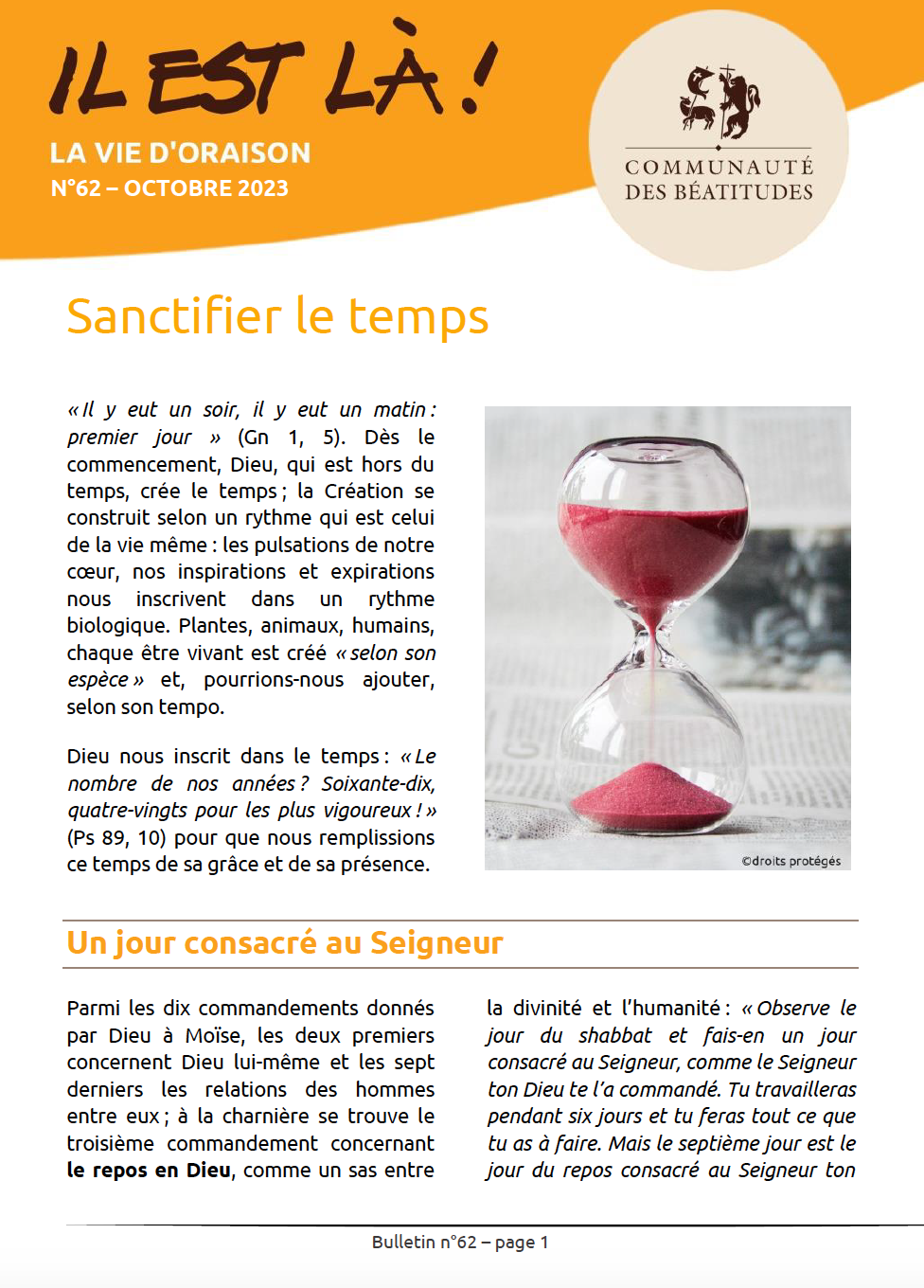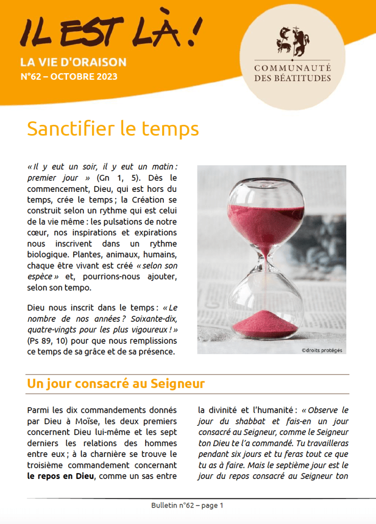 Dieu nous confie le temps pour que nous le remplissions de sa présence, par la prière et l’action de grâce : « Soyez toujours dans la joie, priez sans relâche, rendez grâce en toute circonstance[7]. » Prier sans cesse, c’est un défi pour tout chrétien ! Comment trouver le temps de prier dans nos journées tellement remplies, où chaque activité nous semble être une course contre la montre ?