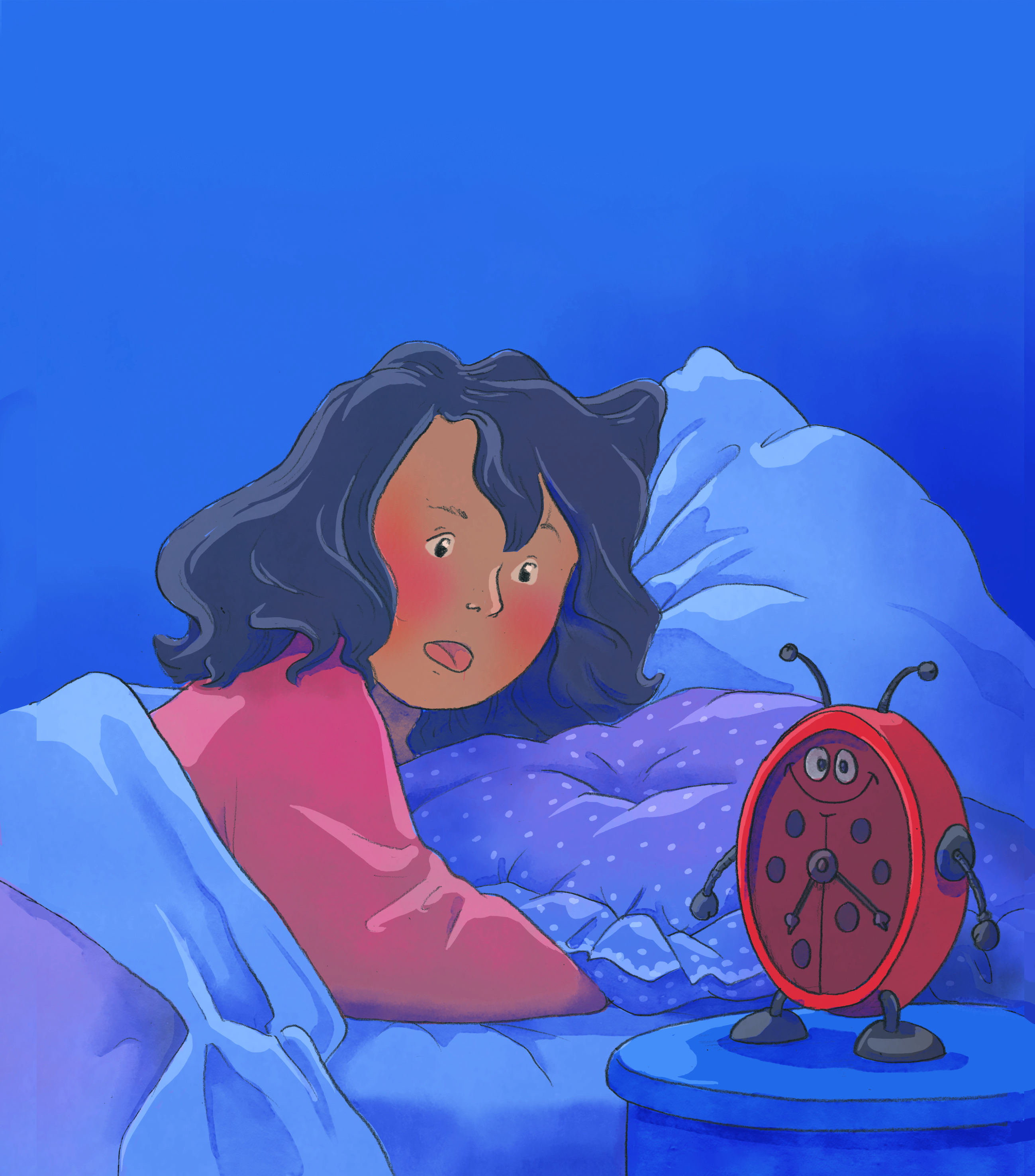 Sur la table de nuit, le réveil en forme de coccinelle fait tic-tac, tic-tac. Priscille regarde avec colère les aiguilles qui brillent dans le noir.