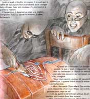 – Il y a bien longtemps, il y avait la guerre, en France, en Belgique, en Allemagne. Ton grand-père est parti pour défendre son pays, il était soldat, comme beaucoup d’autres garçons de cette époque. Mais il a été fait prisonnier et est resté longtemps dans un camp, en Allemagne. Dans ce camp, il y avait aussi un soldat belge et ils sont devenus amis. Ils parlaient de chez eux, de leur vie d’avant, de leurs parents qui les attendaient, de tout ce qu’ils feraient quand ils rentreraient chez eux. Justin – c’est le nom de ton grand-père, tu le sais ? – avait toujours vécu à la campagne et il était malheureux dans ce camp, enfermé jour et nuit dans le dortoir ou dans la cour, sans voir les arbres, les champs, les fleurs, et le paysage de Lorraine qu’il aimait tant. Son ami lui dit un jour : pourquoi ne dessines-tu pas ta maison ? Justin n’avait ni feuille, ni crayon. Il n’avait que le coffre de bois qu’on leur avait donné pour y ranger leurs affaires. Avec son couteau, il a commencé à graver sa maison. Chaque jour, il dessinait un mur, une fenêtre, une pierre. Puis il a ajouté le ruisseau, l’arbre, les nuages. Quand ses camarades lui demandaient ce que c’était, il répondait : le rêve du prisonnier ! Et chacun se mettait à raconter des souvenirs sur sa maison, sa ville, sa région. Tous reprenaient courage et savaient qu’un jour, la guerre finirait et qu’ils rentreraient chez eux.