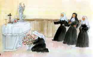 Elle prie donc prosternée, c’est-à-dire étendue sur le sol durant une heure, en souvenir du Jardin des Oliviers où Jésus se préparait tout seul à vivre sa Passion.