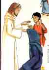 Jésus tend la main vers lui. David, soudain, est pris de peur. Et si Jésus allait attraper, lui aussi, cette affreuse maladie ? Il court, s’accroche au bras de Jésus et le retient. Jésus le regarde et lui sourit en lui caressant les cheveux. Puis il dégage doucement sa main et la pose sur la tête de l’homme, en dessous du manteau qui cache les terribles plaies.